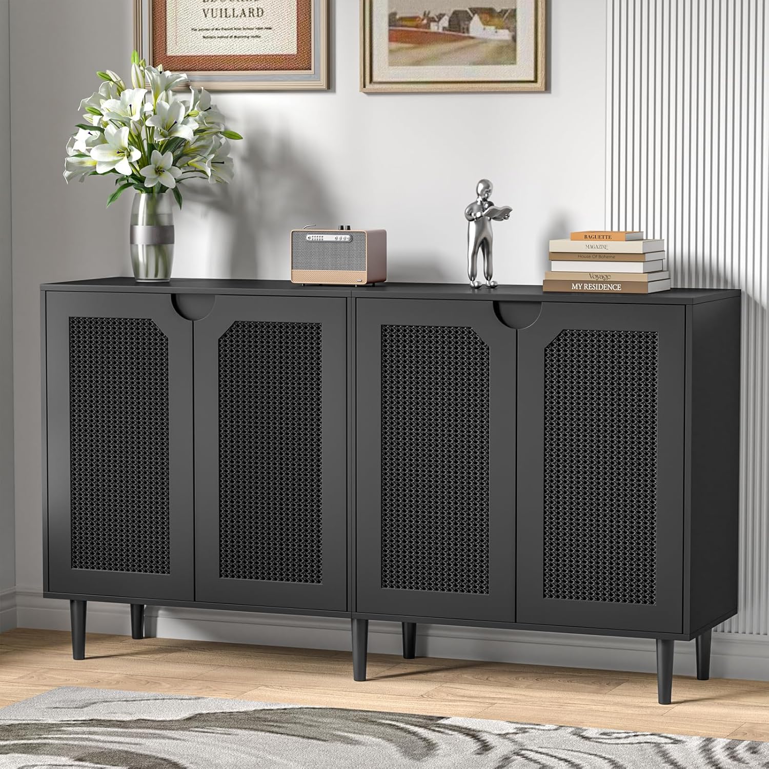 - Natural Woven Rattan: The four doors feature natural rattan with black lacquered, adding a touch of sophistication to the overall design. With its sleek design and ample storage space, it effortlessly combines style and functionality.