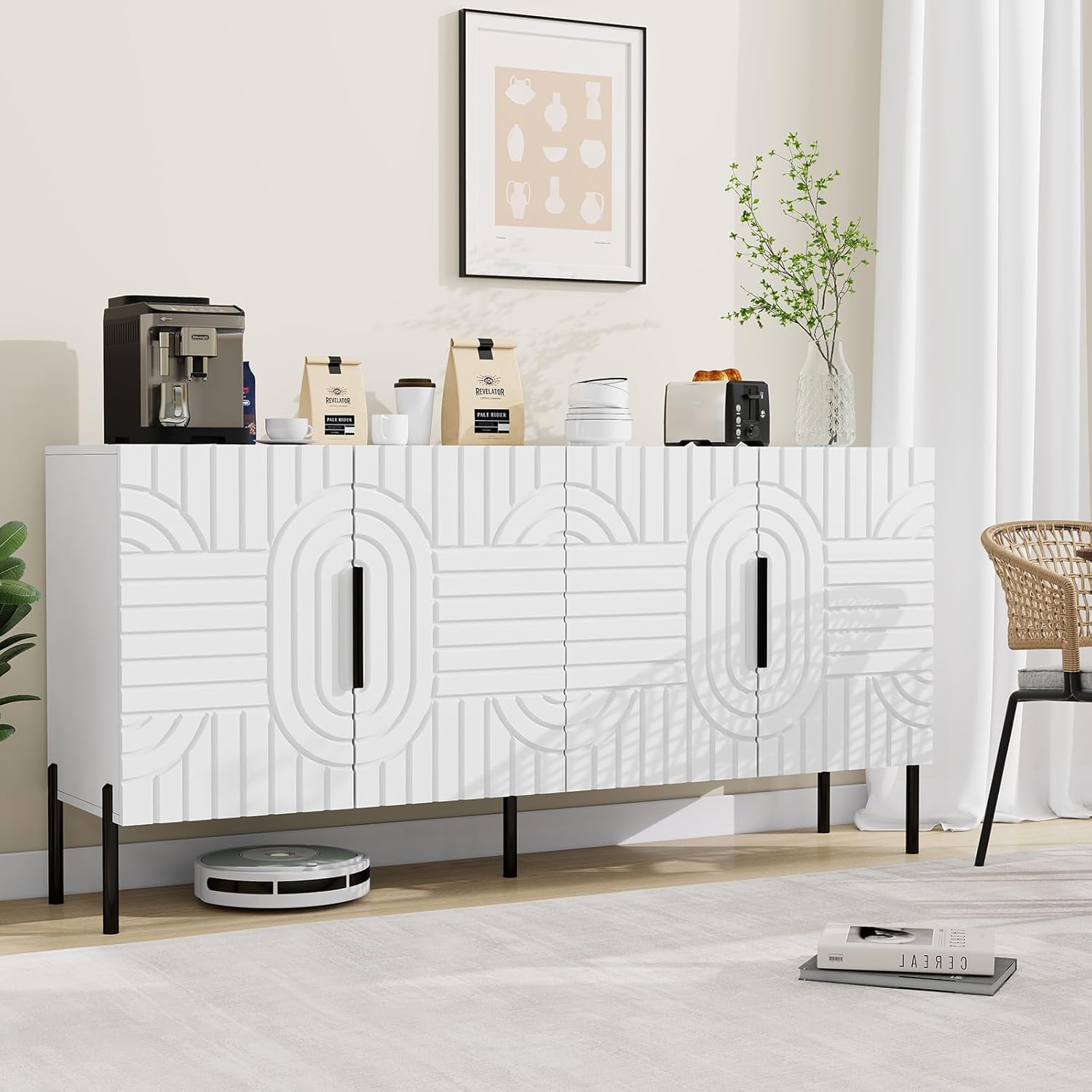 - Stylish Grooved Design: This sideboard buffet cabinet with storage combines an elegant modern style with exquisite three-dimensional grooved carvings, creating a unique visual effect on the white cabinet body. The white buffet sideboard storage cabinet fits effortlessly into various home settings, including the dining room, living room, kitchen, or entryway, thanks to its clean, minimalist design. The white buffet cabinet with storage is both a functional storage solution and a decorative piece that enhances your indoor space, offering efficient storage while becoming a standout feature in your home.